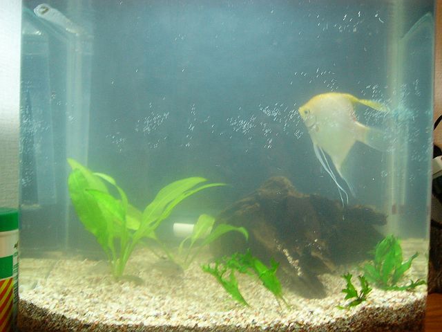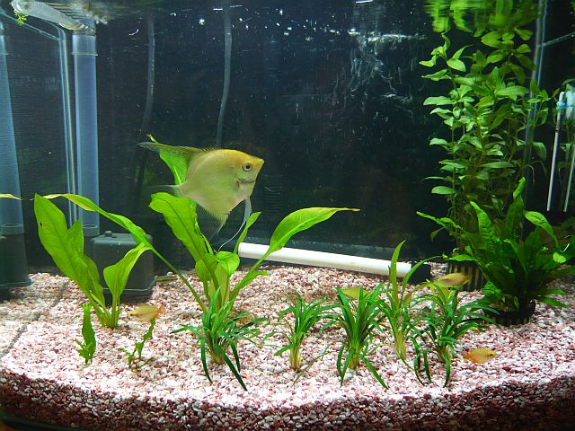 実は少し前にゴールデン・ハニードワーフグラミーを2匹追加した。一応いい関係を作っているようである。やはりグラミーくらいでないとエンゼルと遣り合えないのかも。そういえばそのとき思ったのだが今までプラチナエンゼルと思っていたのはゴールデンエンゼルだった!最初白かったのでプラチナだと思っていたから途中から頭の辺りが黄色くなっていたのにゴールデンだとは思い直さなかった。改めてゴールデンなグラミーが横に来ると同じ色じゃないか!ってことで気がついてしまった。