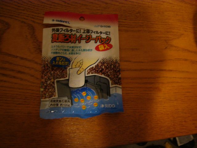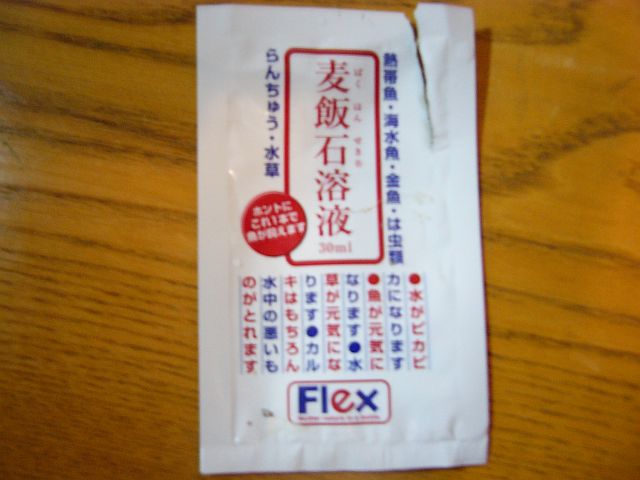 さて、掃除も終わり水槽をセットして水を半分くらい入れたが魚を入れる前に以前もらった麦飯石溶液というものを使用してみた。どうもこれだけで水作りはばっちりらしい。失ったバクテリアを多少はこいつの力で補ってくれるかなぁ。