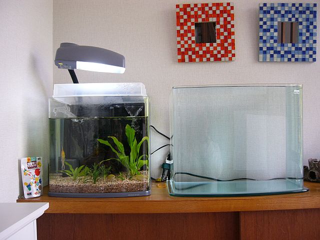 なんて一段落していたのだがブックオフに行くと45cm水槽が安く売っていたので買ってしまった。。。横に並べてみるとずいぶん大きく見える。2つの水槽は置いておく場所がないので45cm水槽に移そう。さて、GW中にセットアップして移動を完了しなくては。