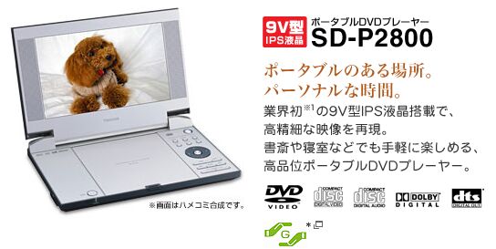 そんな中9インチで800x480の画素を持っていてさらにIPS液晶で見やすいという東芝のSD-P2800というものが候補にあがる。さらにはベッドルームのTVを実家にあげちゃってないのだがTVチューナーも付いているのでTVもみれちゃう。もう一つついでにいうと車のTVはアナログだし、サイドブレーキを踏んでいないと映像が見えないのだがついこの前ワンセグチューナーも発売されていたのでワンセグの画質は悪いとはいえ一応見えるようになる。完璧じゃん、実際電気屋で見てもきれいだし。