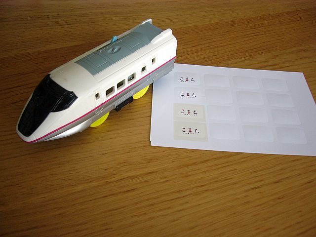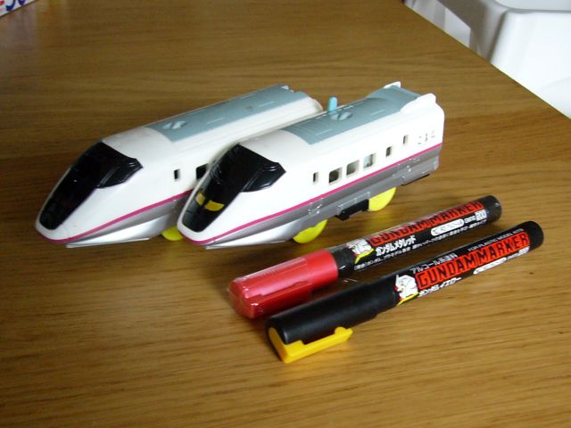さて、プラレールといえば時代だかパッケージによってライトが点いていたり、ロゴマークがついていたりと違いがあるようだ。たとえば我が家にあるコマチはライトが黒いままでロゴマークもないためなんとなくしっくりとこない。適当に書いちゃおうかとも思ったが即座に却下し、フォトシールセットに印刷をして張ってしまおうと考えた。綺麗な状態のロゴマークは中々探すのが難しかったのとサイズの調整が必要なのとプラレールが真っ白じゃなかったので色の調整をした。ライトはシールも考えたし、プラカラーも考えたが面倒なのでペン型のガンダムカラーを買ってきて塗ってみた。