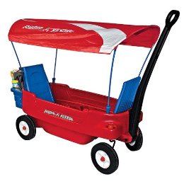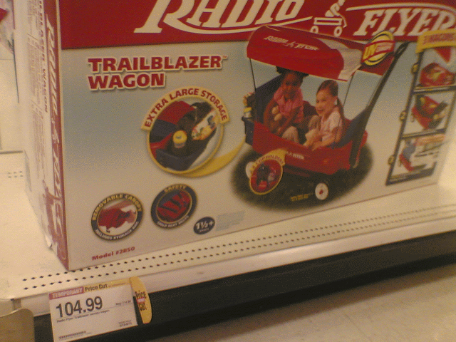TrailBlazerWagonは中のふたをあげると椅子になったり、キャノピーがついていたり実用性がありそうだ。値段は$10安いだけの$104.99。