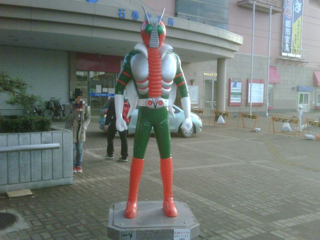 そんなわけで今更と言われつつ、一度足を運んだのである。仙台まで新幹線でそこからはバスで石巻に。途中大街道を通って行ったが急に光景が変わった。そこら辺にダメになった畳を始め家財道具が出されていたがまだ処理は間に合っていないようだ。船や車がありもしないところにあったりもする。石巻駅前の水は引いていたが泥・ゴミや傷跡はまだまだ残っており、駅前の仮面ライダーV3がなんとなく寂しげである。