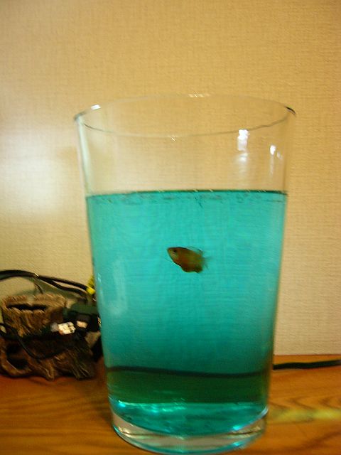 弱まっていたグラミーだが相変わらず餌にも食らいつかず、目の色がどんよりしてきた。バケツにではあるが隔離してみることにした(1匹だし酸素はアナバス系だからなくても大丈夫かなぁ。水温も季節的に大丈夫そうだし)。ついでにメチレンブルー液を少し垂らしたのでもしかしたら病気だったら治ってね!