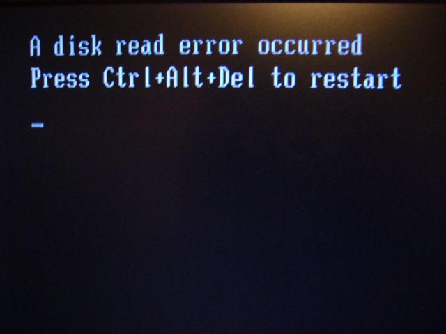 "A disk read error occurred"と下のように表示されてしまう。外付けのHDDなど余計なものを取り外してみたり、電源を入れなおしてみたり、CMOSリセットをかけてみたりしたがだめである。