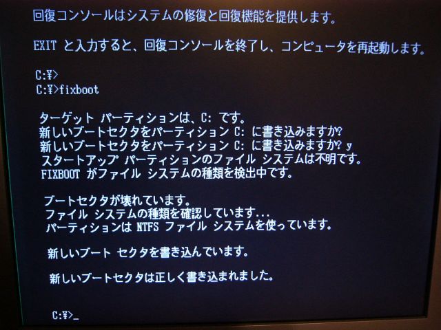 調べてみるとWindowsの回復コンソールでfixboot, fixmbrなどを試すべしとわかったのでやってみた。なんか正しく書き込まれたと書いてあるので直ったかなーなんて思って再起動してみるとやっぱりだめだ。