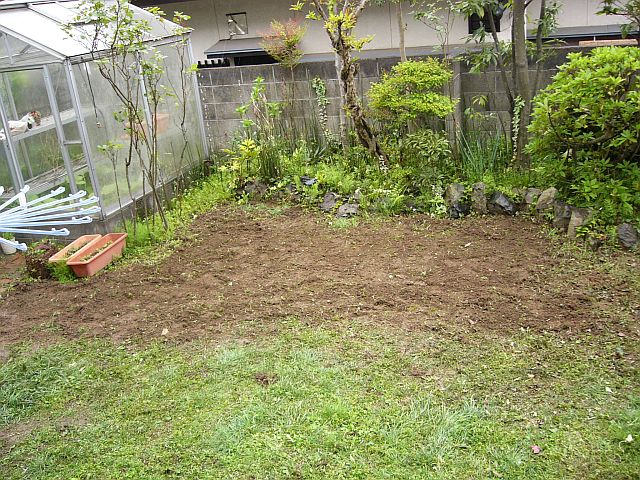 っていうのでGWに気合を入れて草むしり&芝張り準備。2日かかって芝張り部分の雑草を大方むしったので今日は耕して一応石灰を撒いておいた。来週か再来週の天気のいい日に芝を張ろう。